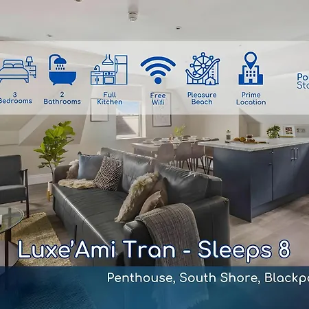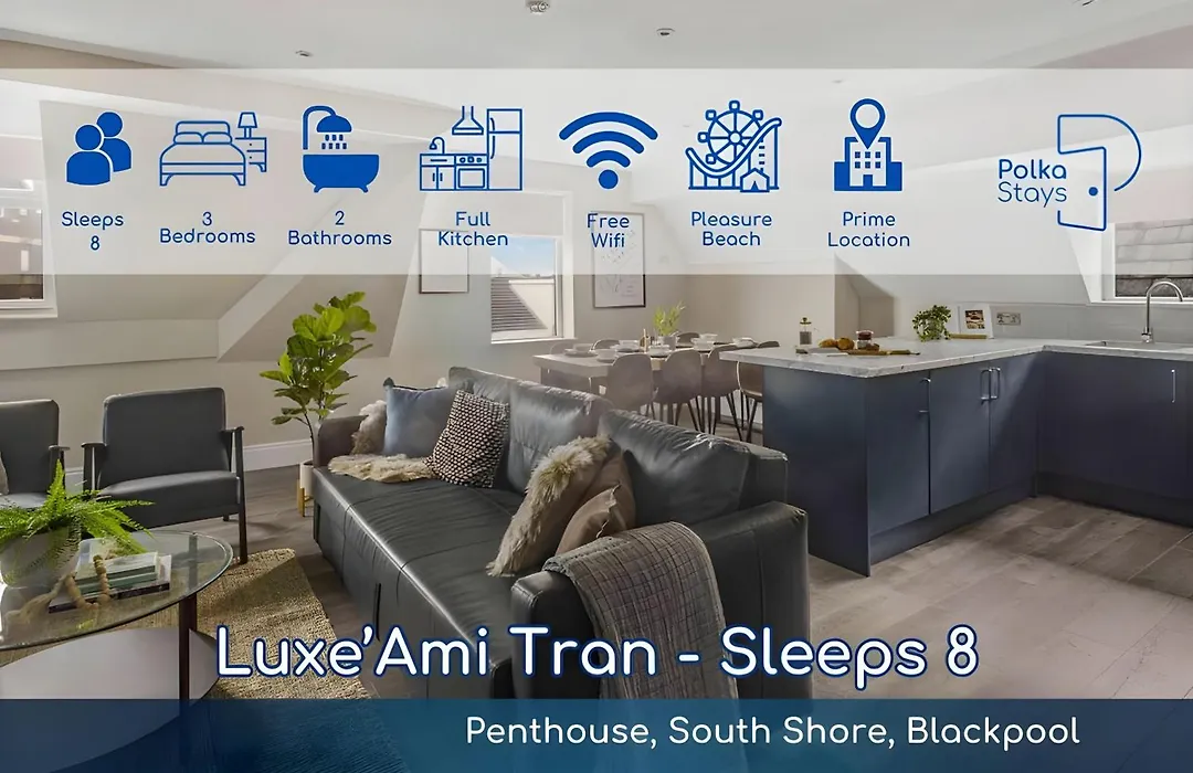 The 70 m² Luxe Ami Tran Spacious Penthouse By Polkastays Blackpool apartment is situated within 5 minutes' walk of Grosvenor Casino Blackpool and 5 km from Blackpool International airport.